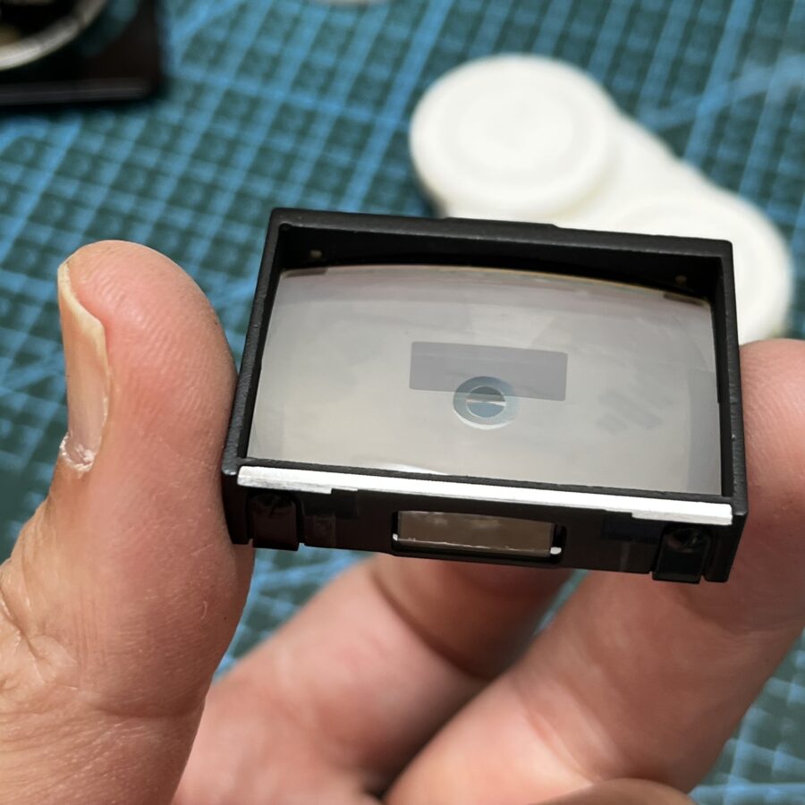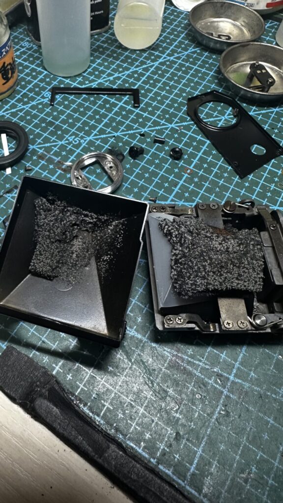 ファインダーはプリズムを分解するかしかいか修理屋によって基準が違います。プリズムまで分解するとほとんどが上記のようにモルトが加水分解されています。それで当店では必ず分解清掃することにしております。