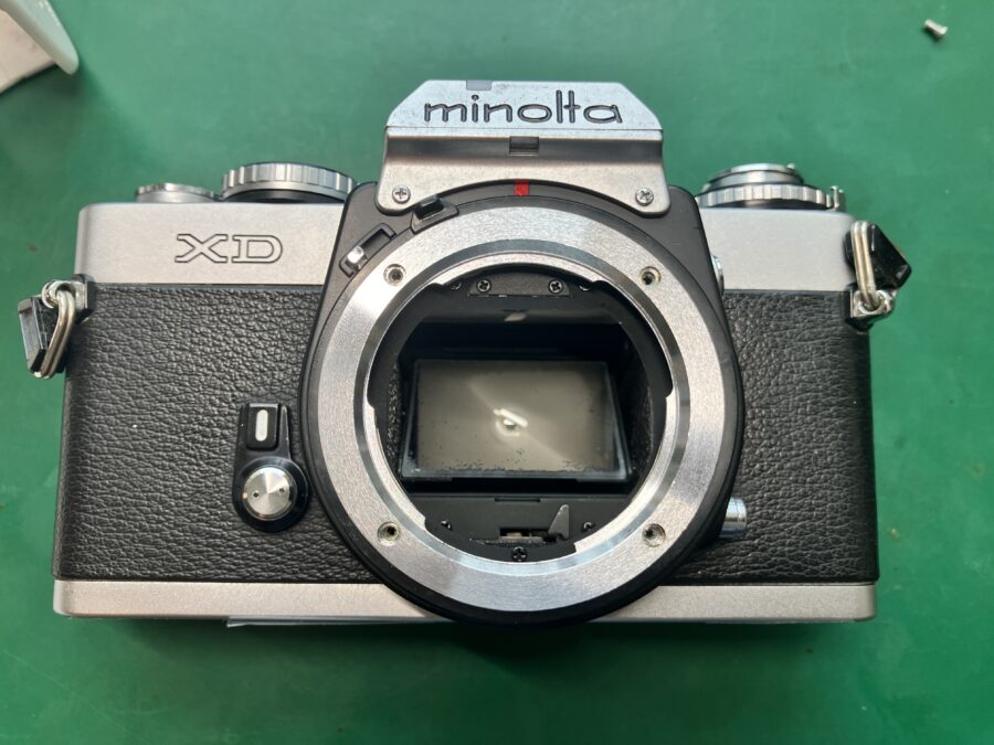 MINOLTA XD は、機械式と電子制御を組み合わせた、当時としては先進的な構造を持つカメラです。そのぶん精密な部分が多く、長い年月を経た現在では、電子系と機械系の両方に不具合が出やすい傾向があります。絞り連動やメーターまわりの動き、シャッター羽根のわずかな油分など、細かな要因が全体の動作に影響しやすい機種です。