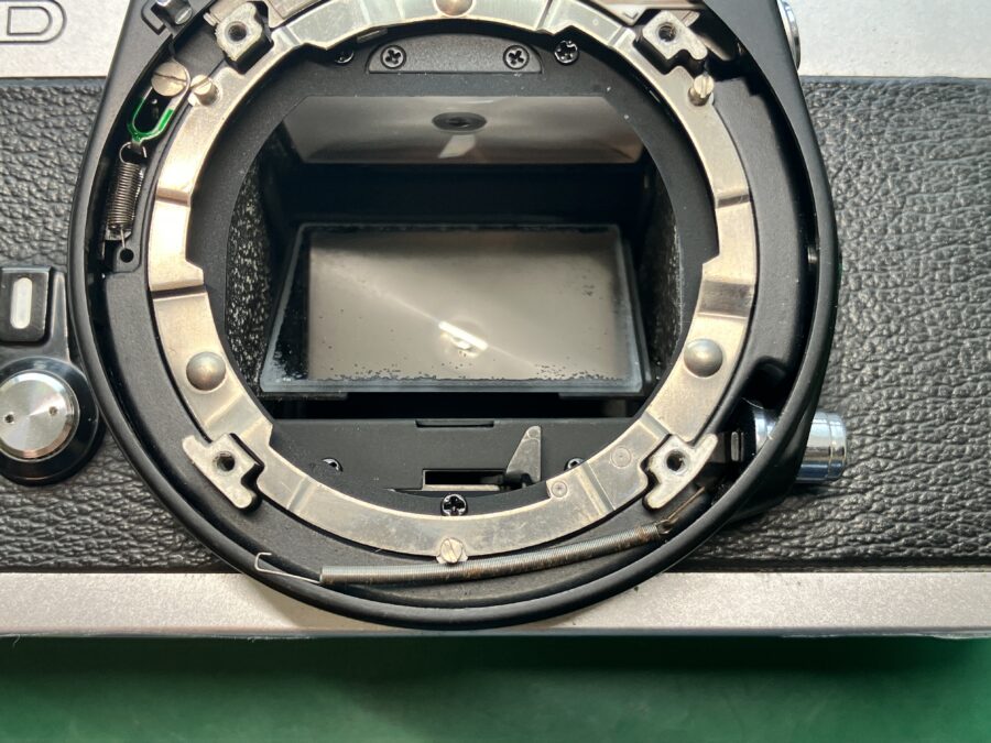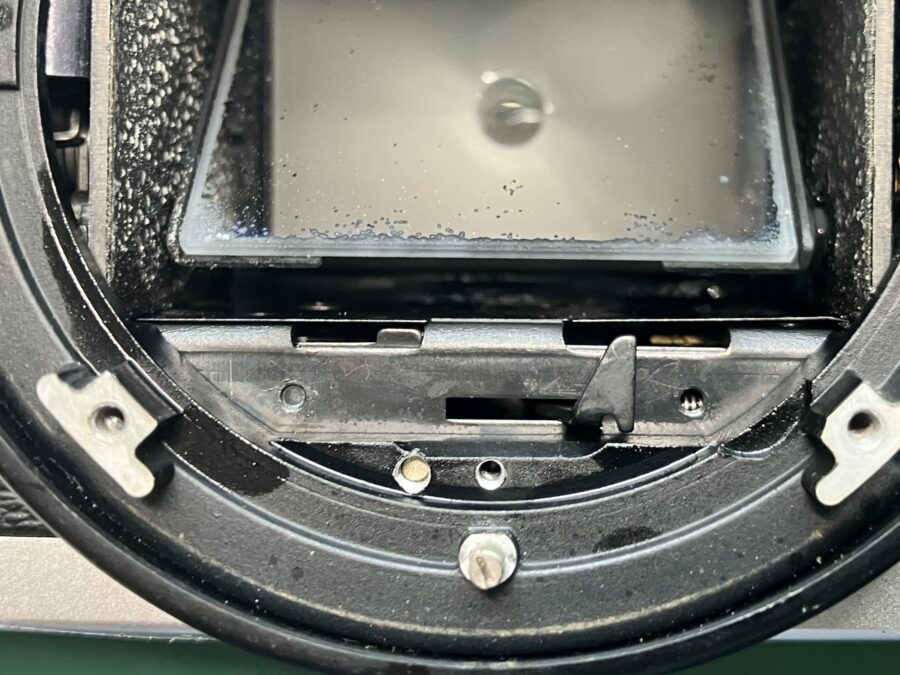 また、絞りを動かすレバーの固着も多く、ミラーボックス側の汚れや油分の乾きが影響します。レバーが動かない場合は、露出制御や AE 動作にも支障が出るため、根本から整える必要があります。