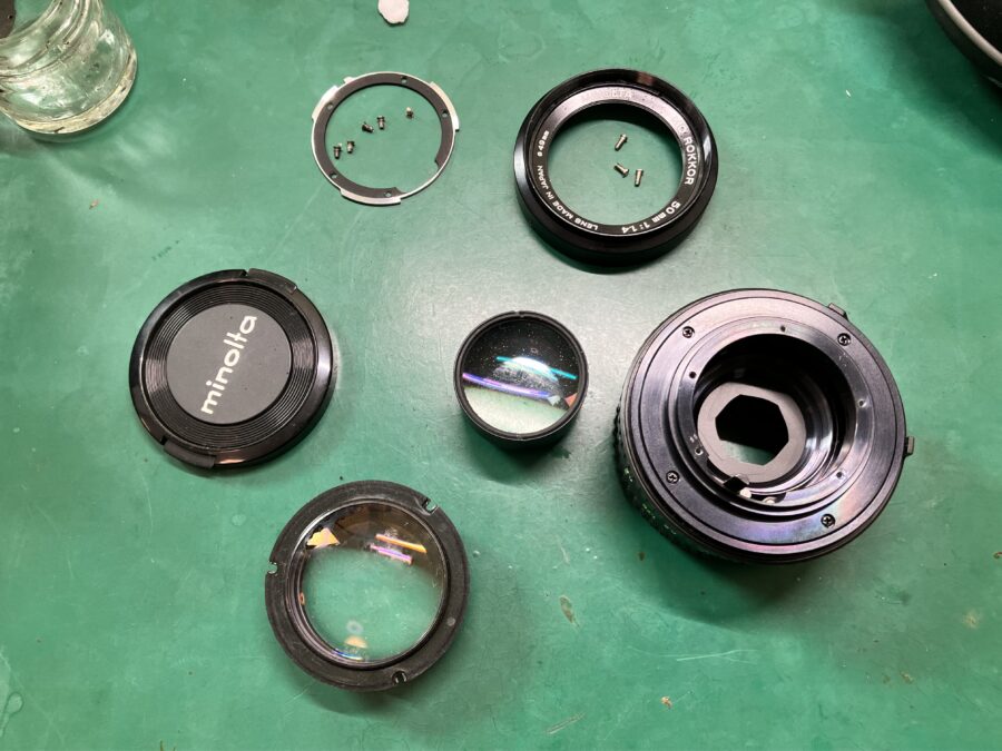 付属のレンズにもカビが強く出ており、とくに前玉のカビは浸食跡が残ってしまうレベルでした。カシメ構造のため分解に手間がかかりますが、丁寧に処理しながら清掃を進めています。