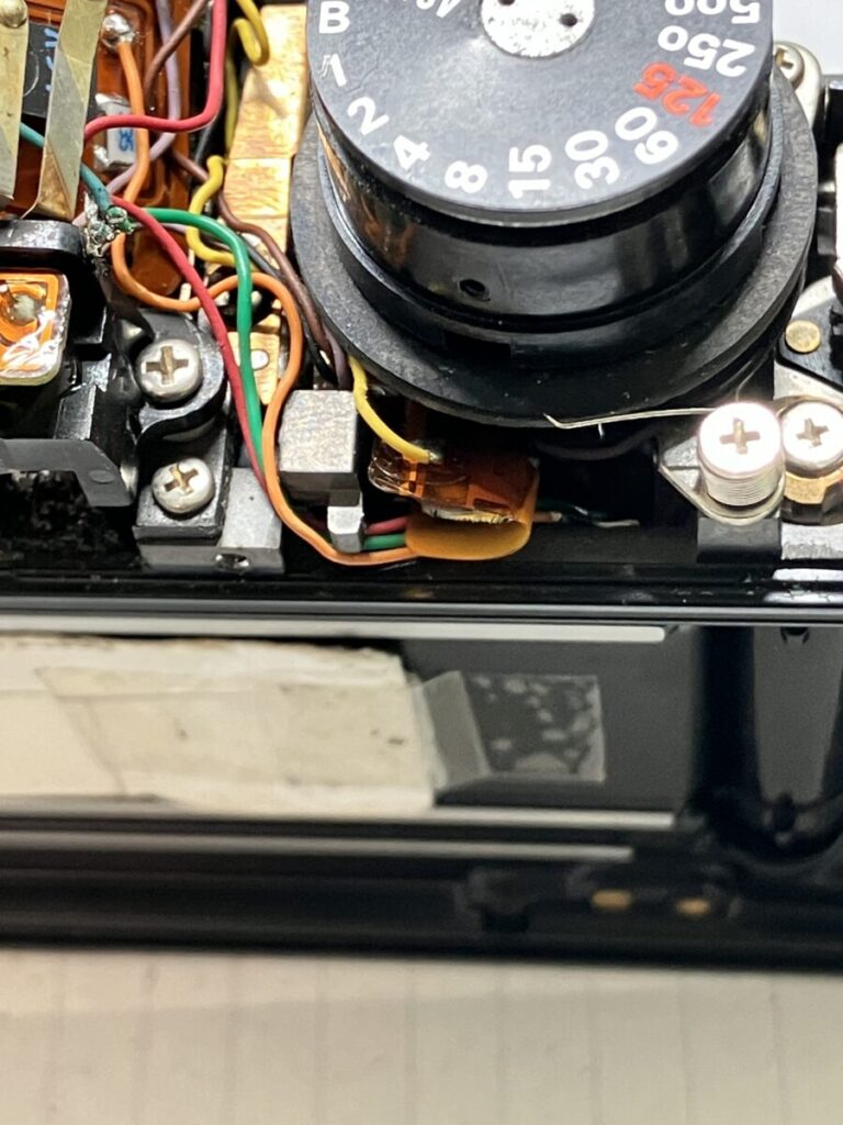 FM2の露出計は機械式ボディの中で唯一電気を使う部分で、ここが正常に動いているかどうかが、整備時の確認ポイントの一つです。