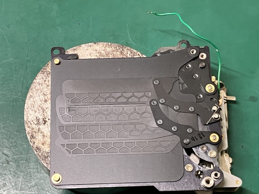 また、絞り値を表示するための小さなミラーが脱落している個体もあります。このミラーがボディ内部でずれると、ミラーアップ動作や巻き上げに影響を及ぼすことがあります。脱落していても再固定で対応できる場合が多く、位置調整を含めた整備で改善します。