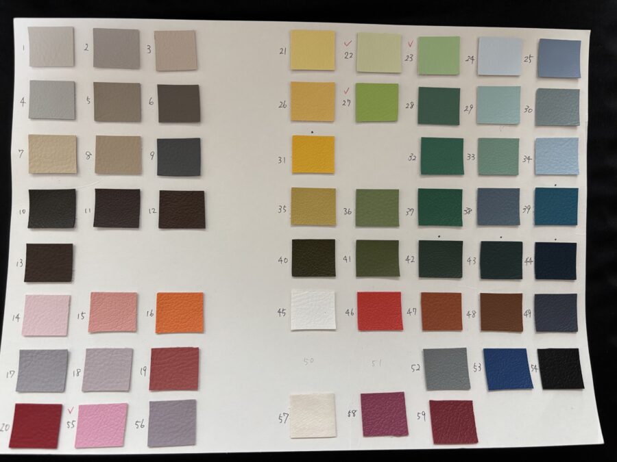 現在、落ち着いた定番色から個性のある色まで、複数のレザーカラーをご用意しています。カラーの色見本は以下です。