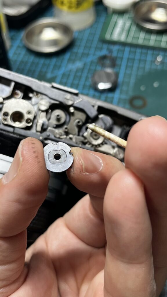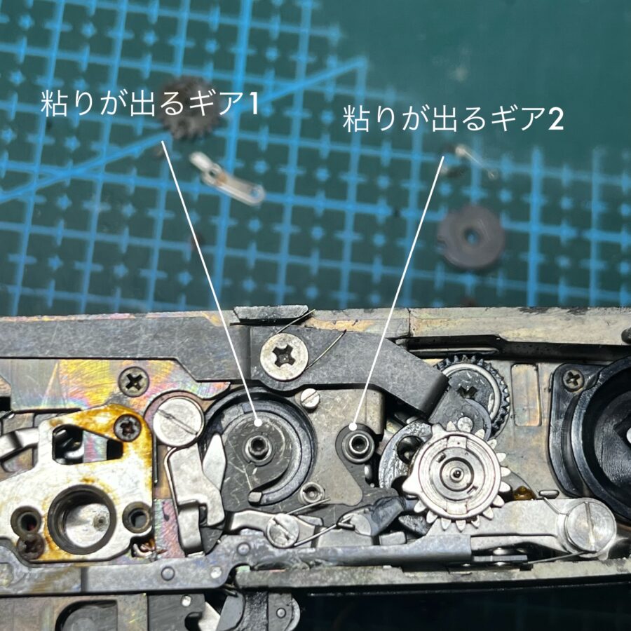 巻き上げの不調は、OM-1の持病と言われています。原因は以下のギア部分のことが多いです。(上の写真参照)ここに油汚れが入り込むと滑ったり、ギアがとまったりします。放置すると他の機構にも影響が出るため、早めの整備をおすすめしています。