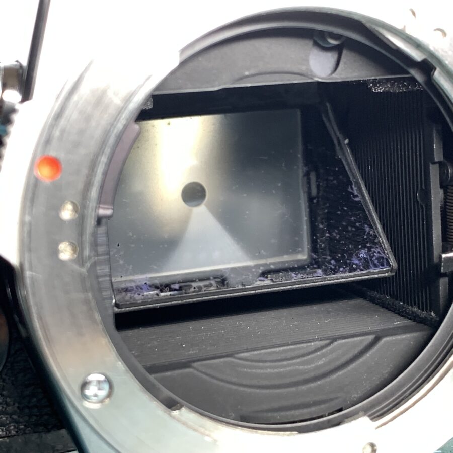 ファインダーを覗いたときに、黒い影やムラが見える症状です。軽度であれば清掃または腐食部分を除去することで改善することもありますが、腐食が進行している場合は交換になります。まだ部品があるのでご対応できます。