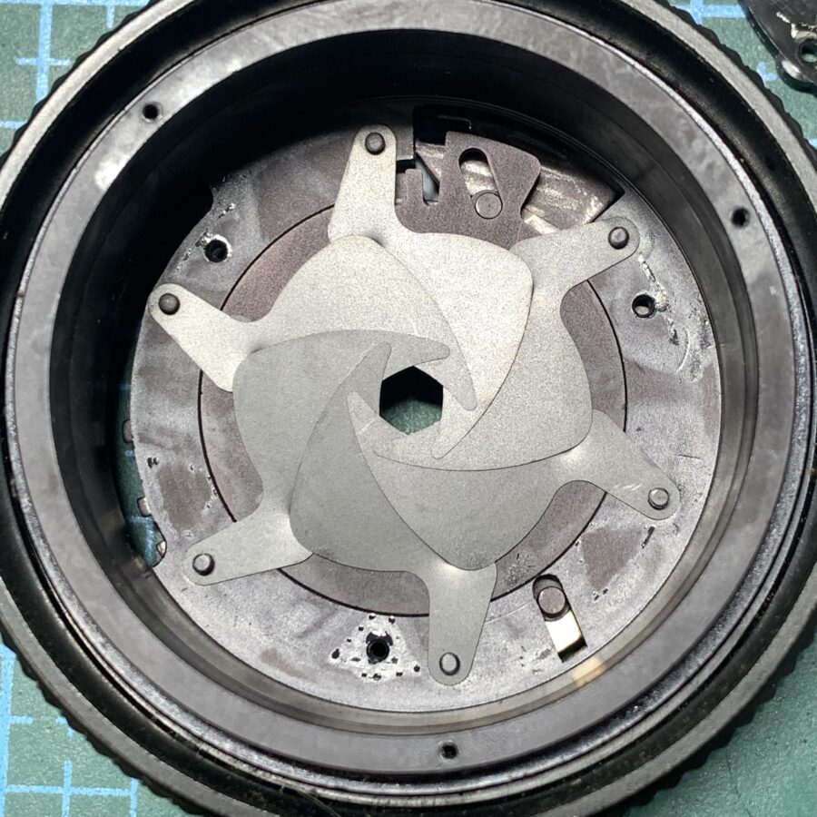 レンズを長期間保管した個体では、絞り羽根の粘りや開閉不良も非常に多い症状です。原因は主に、内部のグリスが経年でにじみ出て羽根の根元に回り込み、動きを阻害しているためです。